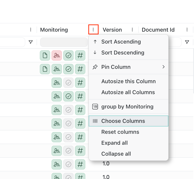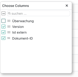 Wenn Sie die Informationen ändern möchten (z. B. den Überwachungsstatus nicht angeben), können Sie das Menü neben jeder Spalte verwenden und „Spalte auswählen“ wählen. In einem neuen Modul können Sie nun alle zusätzlichen Spalten, die meddevo anbietet, auswählen oder abwählen.