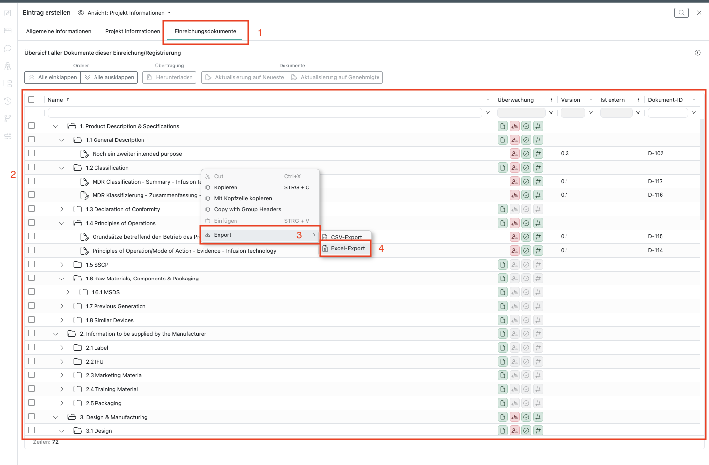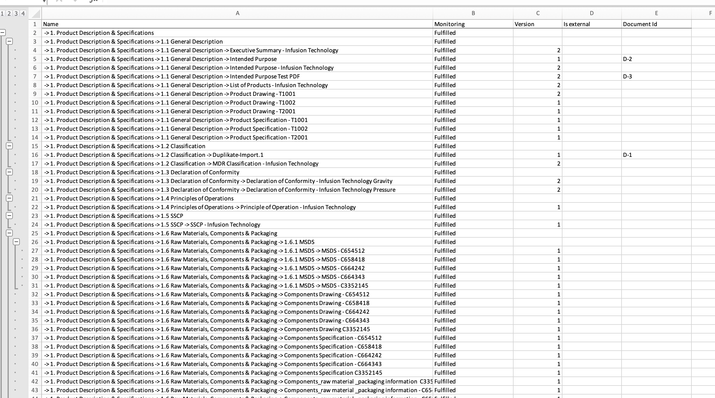 In der entsprechenden Excel-Datei finden Sie alle Ordner und Dokumente aus Ihrer Einreichung, einschließlich ihres Überwachungsstatus, ihrer Version, der Information, ob sie extern sind, und ihrer Dokument-ID: