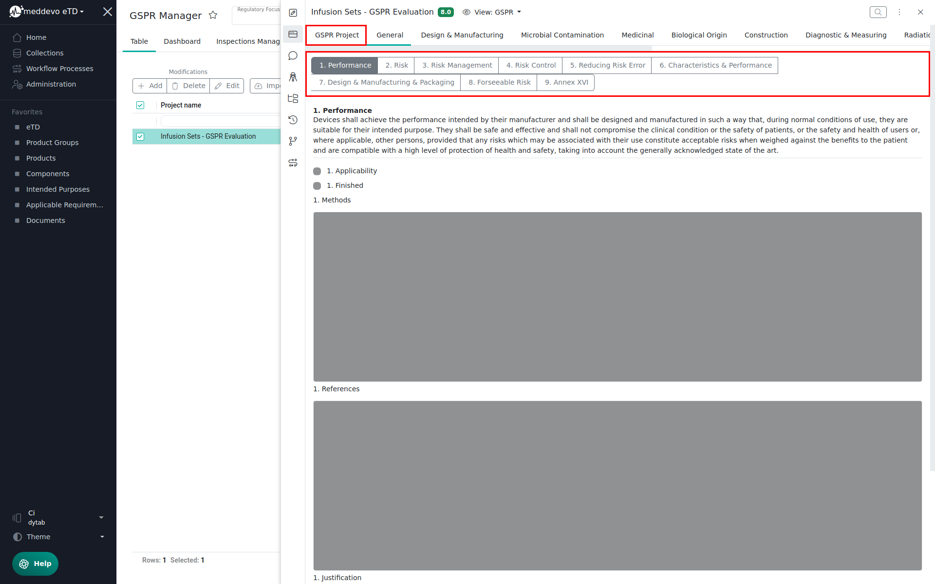 - GSPR Structure: The other tabs follow the same structure as in the EU MDR, for example: