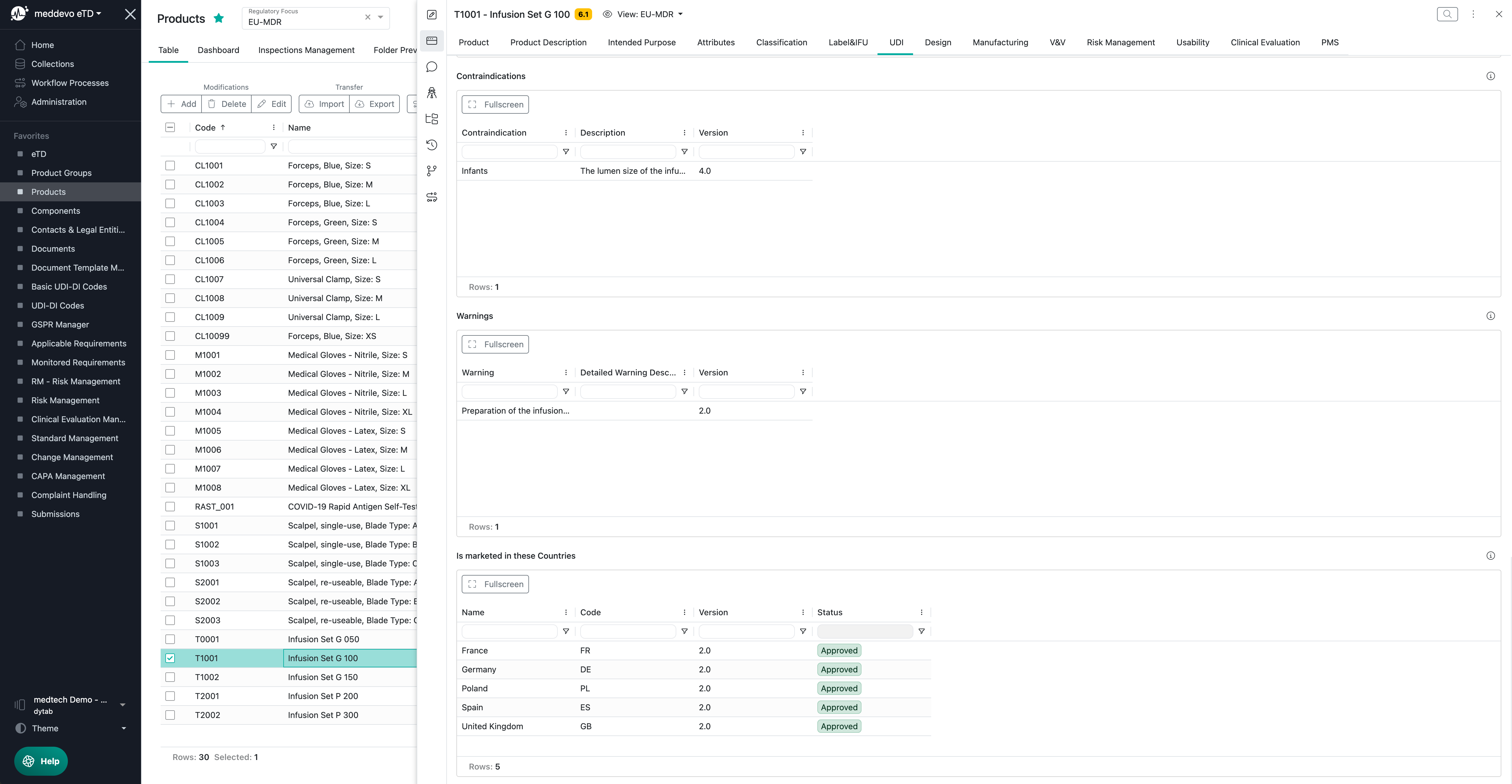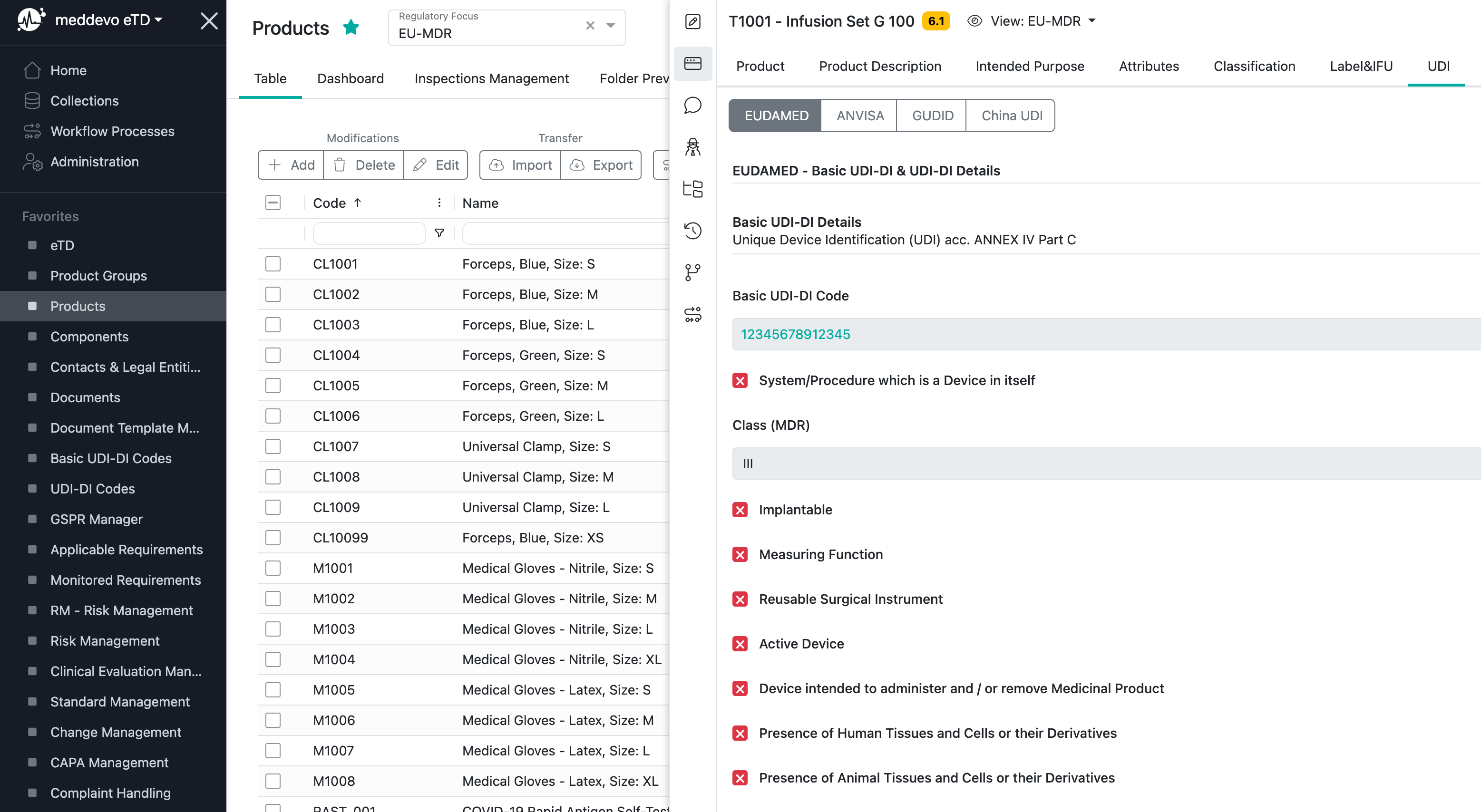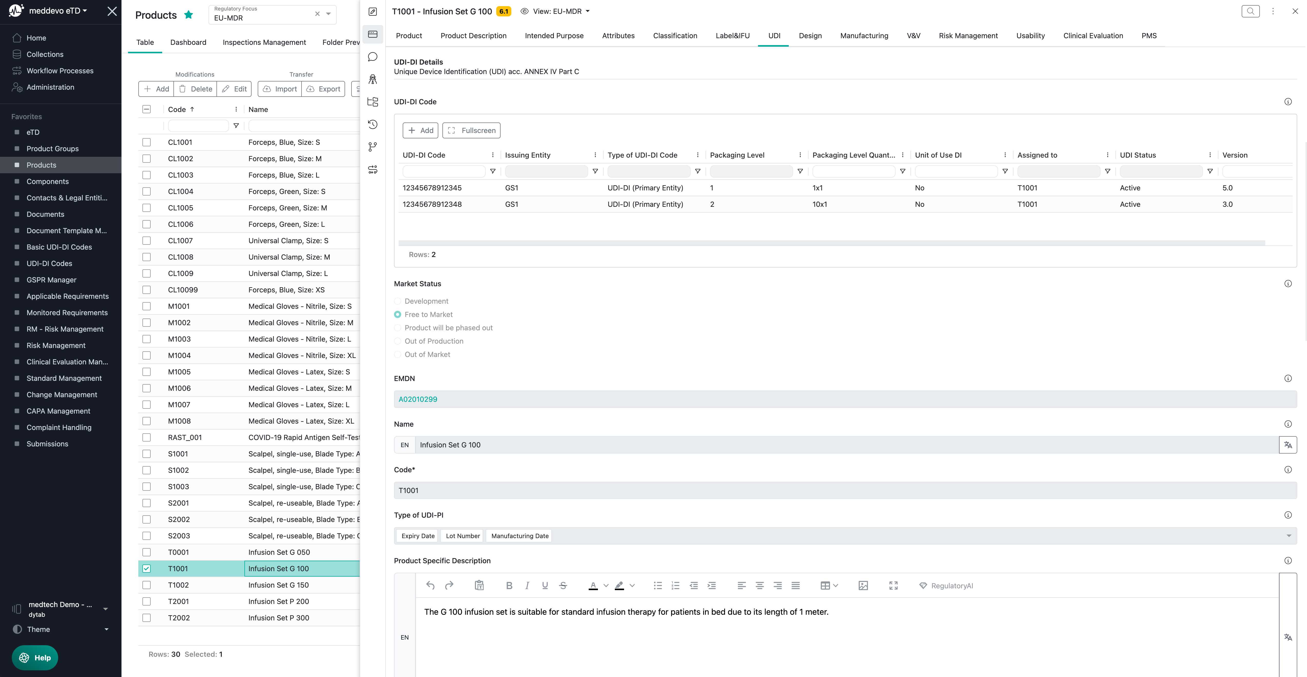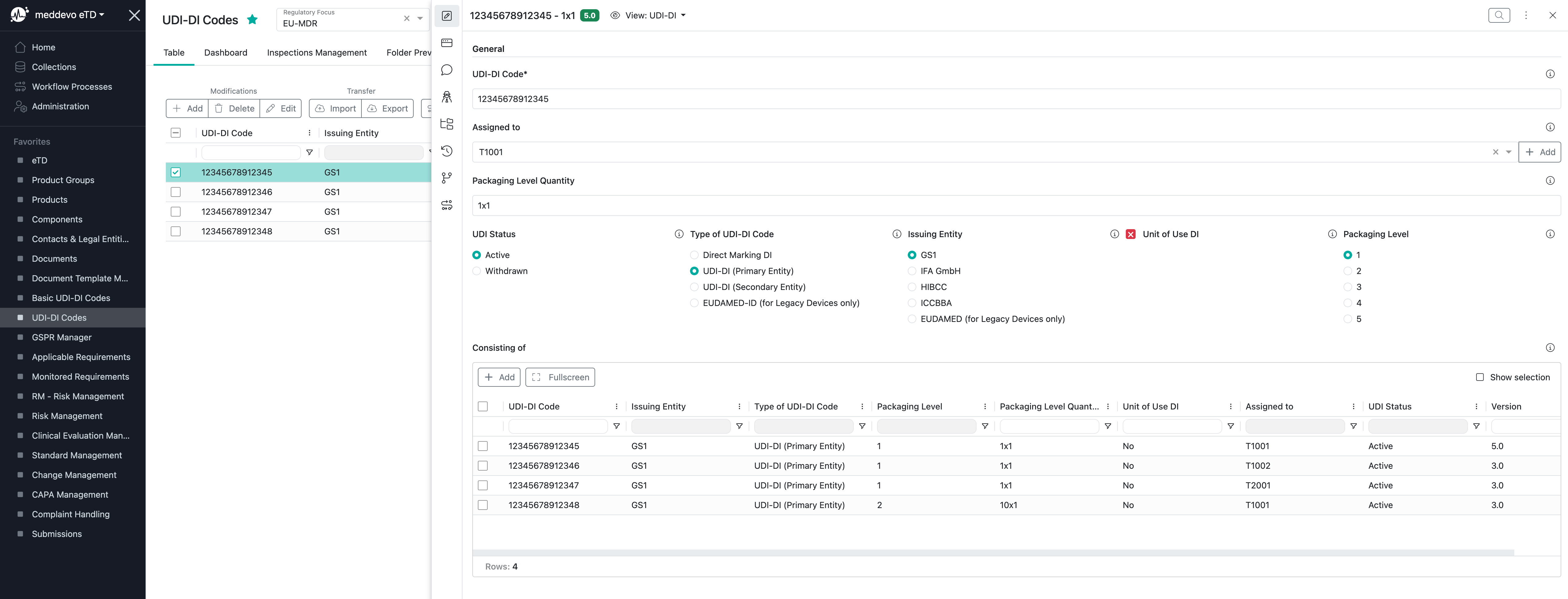 All UDI-DI code relevant regulatory information required for the EUDAMED registration will be managed in your Products collection and summarized in the "UDI" section:
